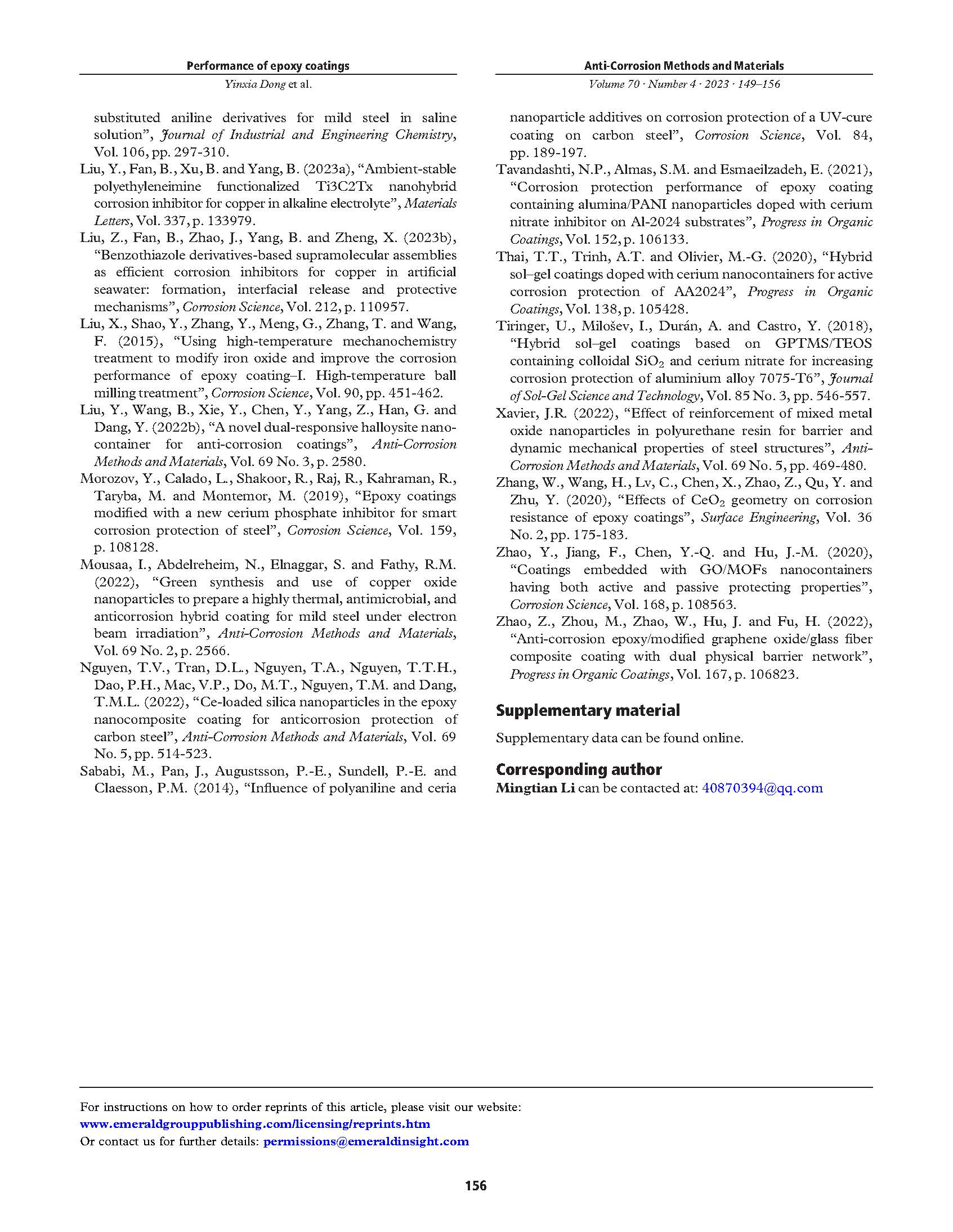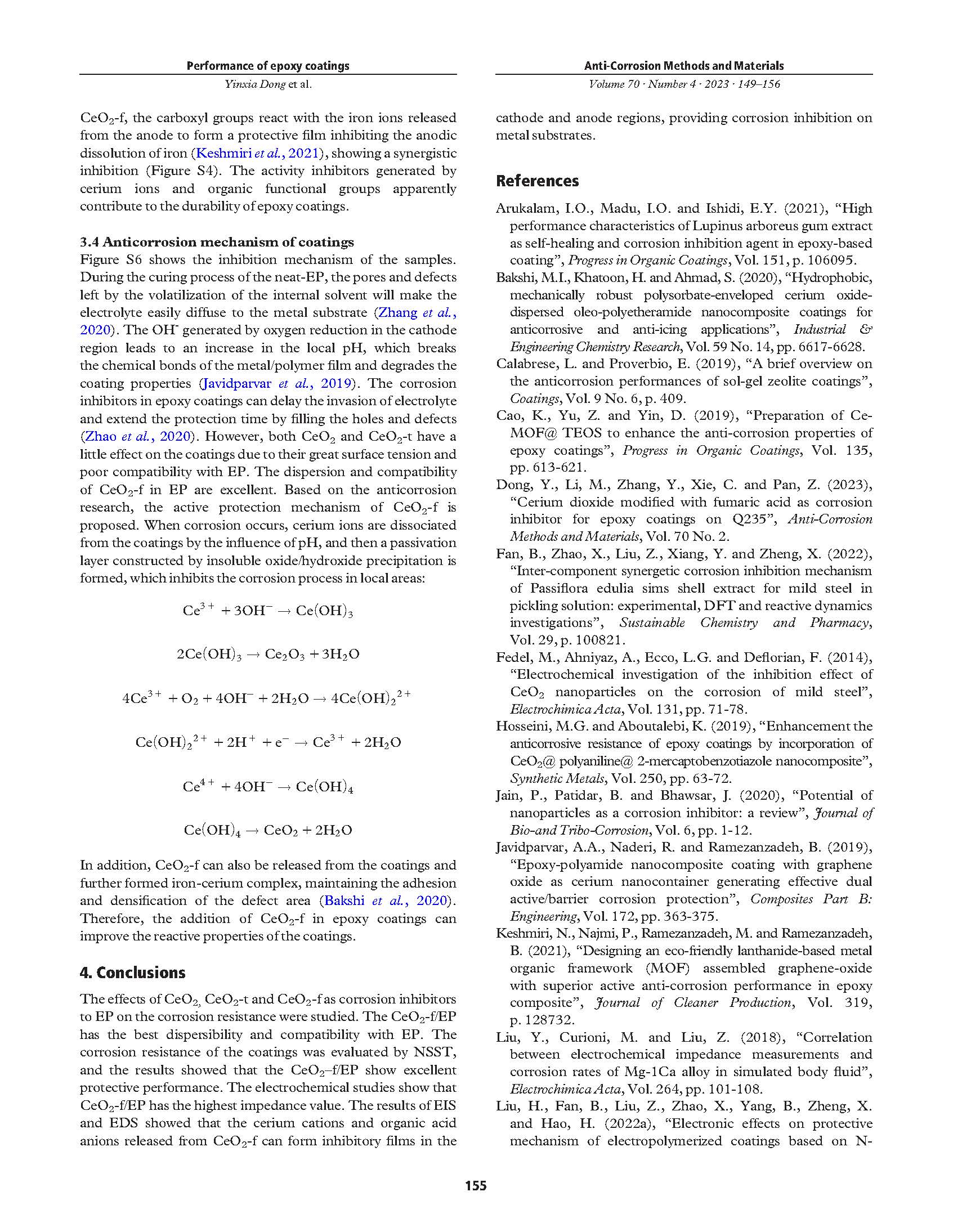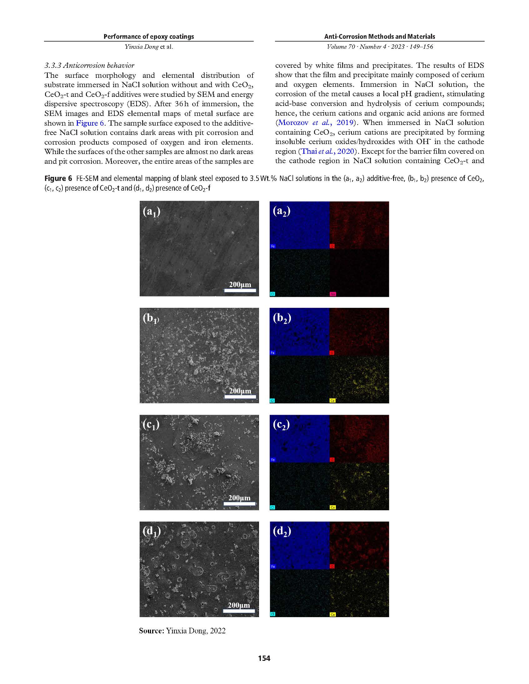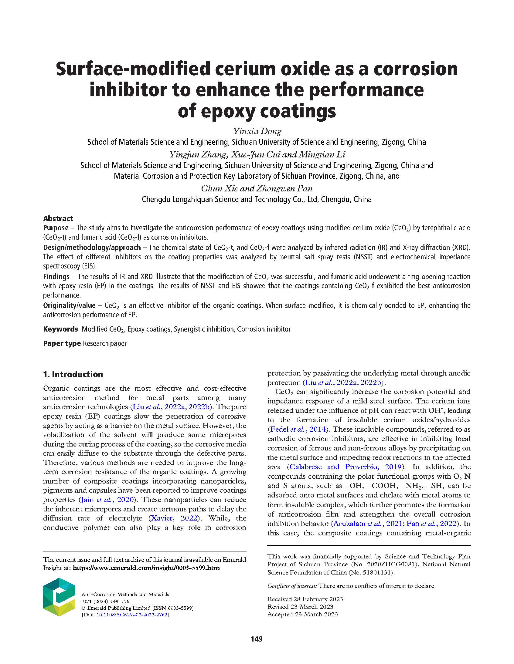 公司发表论文---《Surface-modified cerium oxide as a corrosion inhibitor to enhance the performance of epoxy coatings》, 刊登于《Anti-Corrosion Methods and Materials》